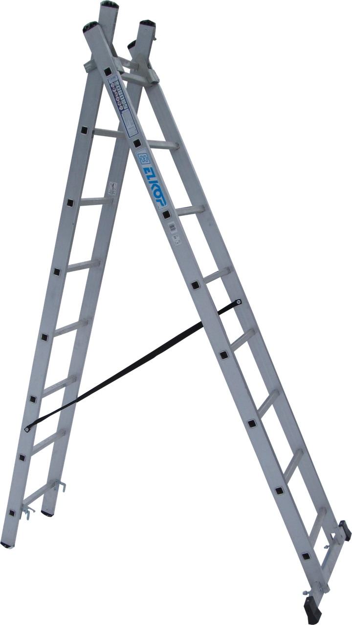 За рахунок розтяжок, драбинаміцно стоїть як стремянка, а також запобігає випадковому складанню. Можна відрегулювати кут драбини, це дуже зручно в невеликому приміщенні. На одній з секцій, внизу велика 76 см поперечна планка, за рахунок якої збільшується площа упору. Діапазон висот – 6-20 сходинок (2,4-9,2м). Протиковзні полімерні упори, рельєфні сходинки, з наскрізним монтажем в опори драбини збільшують її надійність та стійкість.