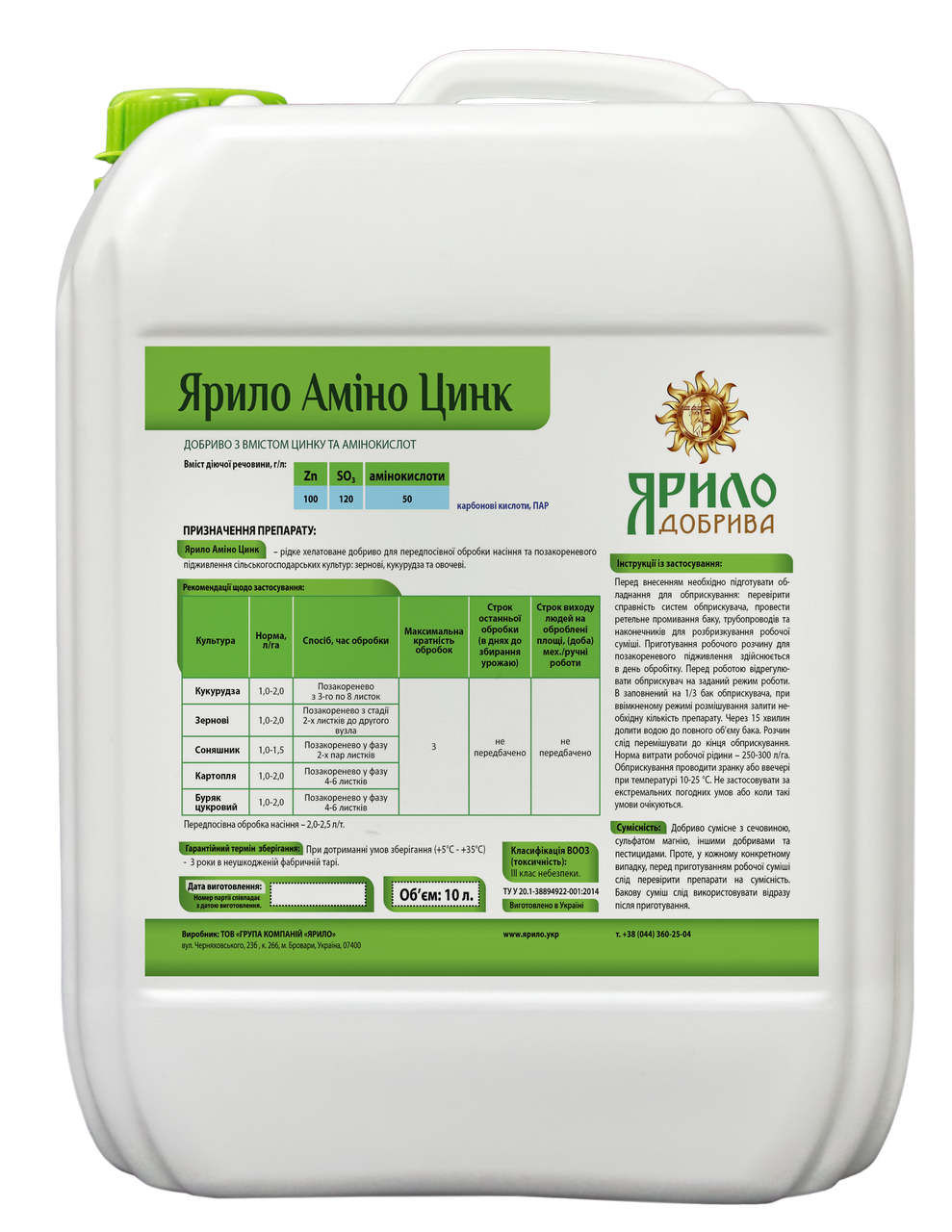 Ярило Аміно Цинк - хелатоване цинкумісне добриво для живлення культур вимогливих до даного елементу. Хелат цинку швидко і повністю проникає всередину рослин. Цинк активує ряд ферментів, які відповідають за синтез білку, приймає участь у синтезі хлорофілу, накопиченню цукрів, що витримувати низькі температури, а також нормалізує і підтримує концентрацію ауксину в рослинах.